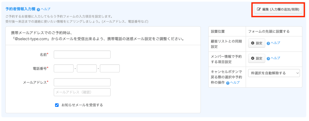 設定できる内容には、名前や電話番号などを入力してもらう「予約者情報入力欄」と、来店時のご要望などを確認するための「質問入力欄」があります。