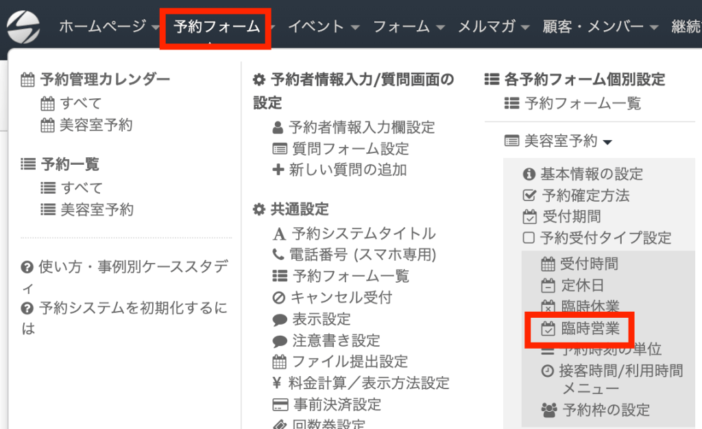 設定するには、メニューから「予約フォーム」→「臨時営業」をクリックします。