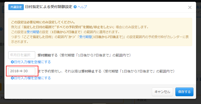 例えば5月以降の予約受付をストップしておきたい場合には「4/30まで予約受付をしてそれ以降は受付停止」というような