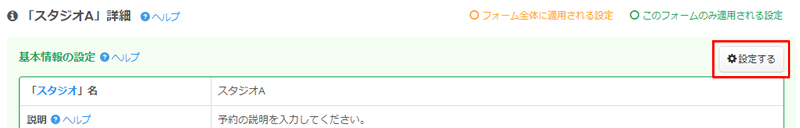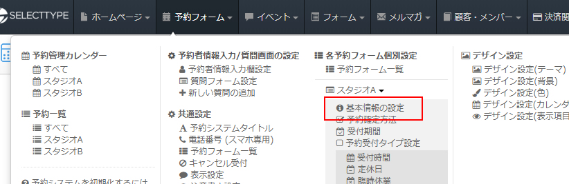 ヘッダーメニューの「予約フォーム」⇒「各予約フォーム個別設定」の「基本情報の設定」をクリックします。