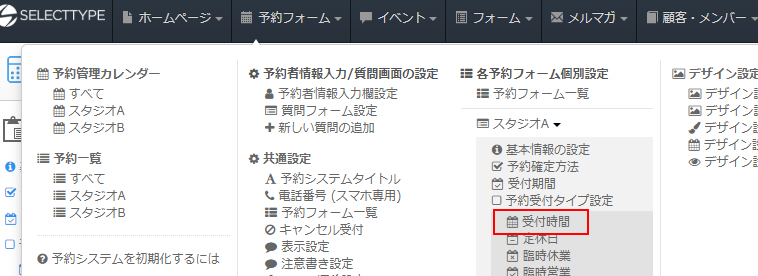 ヘッダーメニューの「予約フォーム」⇒「各予約フォーム個別設定」の「受付時間」をクリックします。