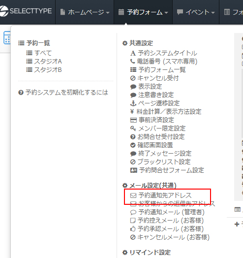※予約通知先アドレス設定(予約システム共通の設定)は上部メニュー「予約フォーム」⇒「メール設定(共通)/予約通知先アドレス」より設定エリアへアクセスできます。