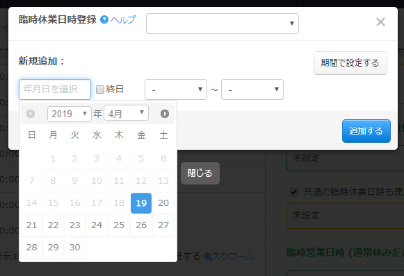 「臨時休業日時設定」は指定した日時の予約を停止する事が出来ます。