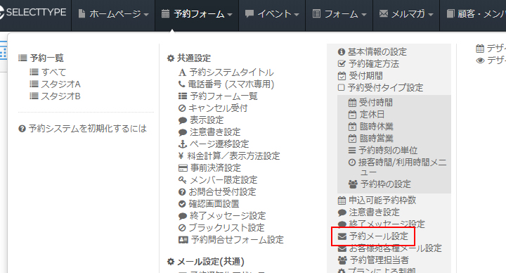 SELECTTYPEから予約に関するメールの設定は「予約メール設定」にて各種設定が行えます。