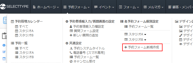 別のスタジオ用の予約フォームを追加するしたい場合は、上部メニュー「予約フォーム」⇒「各予約フォーム個別設定/予約フォーム新規作成」をクリックしますと