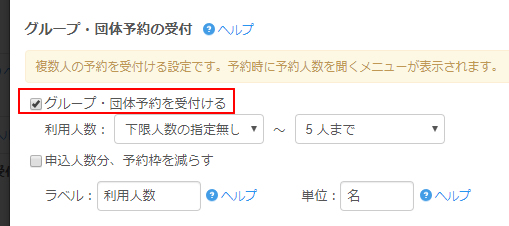 ご予約時にご利用人数をヒアリングしたい場合には「団体受付設定」を有効にします。