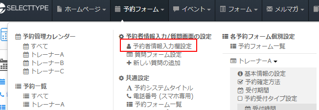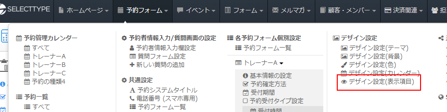 必要な分の予約フォームを登録し終えたら、続いてトレーナーを選択するメニューの表示形式を設定します。