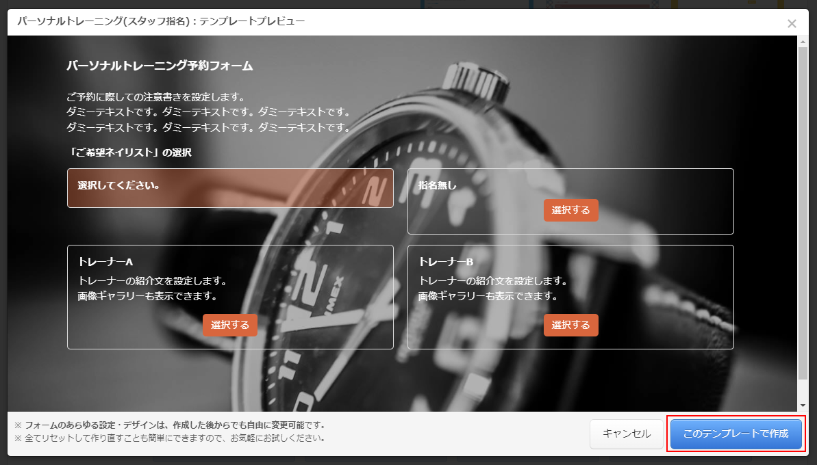 今回は「スタッフ指名タイプ」のテンプレートの中から「パーソナルトレーニング(スタッフ指名)」のテンプレートを選びます。