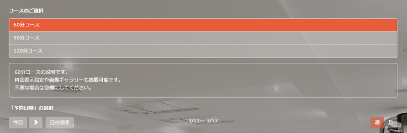 例えば日曜日の9時から18時の間を60分区切りで予約を受付けるといった設定が可能です。