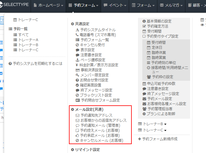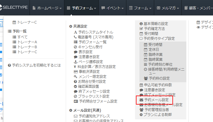SELECTTYPEから予約に関するメールの設定は「予約メール設定」にて各種設定が行えます。