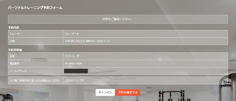 確定されると予約者には控えメール、管理者には通知メールが届きます。