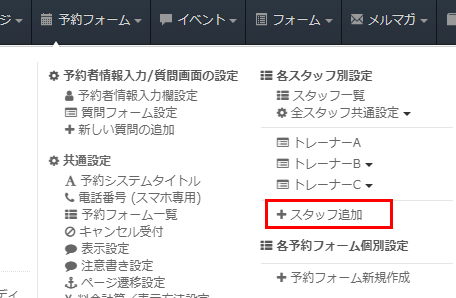 同じように別のトレーナーを登録するには、ヘッダーメニュー「予約フォーム」→「各スタッフ別設定」→「スタッフ追加」をクリックして予約フォームを追加します。