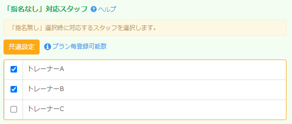 全トレーナー(お店全体)に設定したい場合には、全スタッフ共通設定より設定を行います。