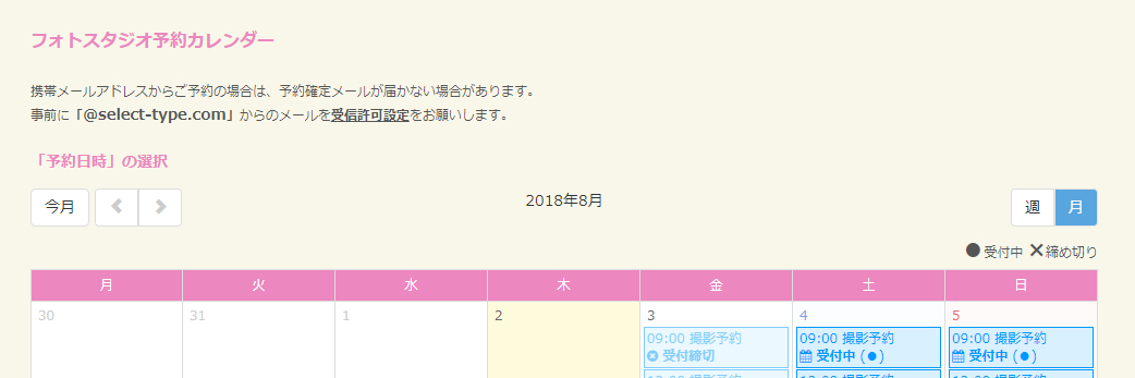 携帯電話から予約をされる場合、ご利用の携帯によっては「@select-type.com」からのメールを受信設定をしないと