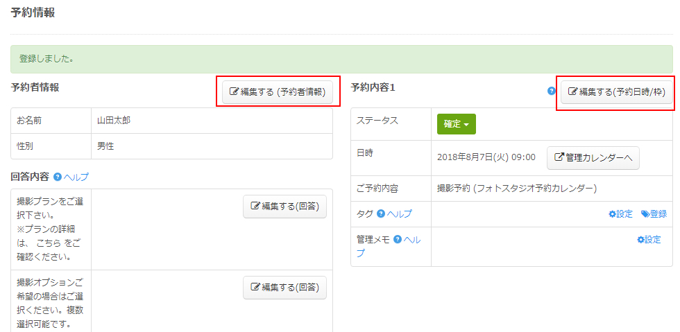 この画面から予約者情報を変更したり、予約日時を変更することができます。