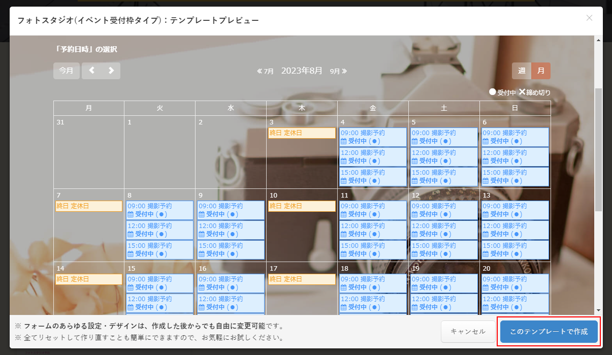 この記事でご紹介するフォトスタジオ予約のテンプレートは「フォトスタジオ(イベント受付枠タイプ)」のテンプレートになります。