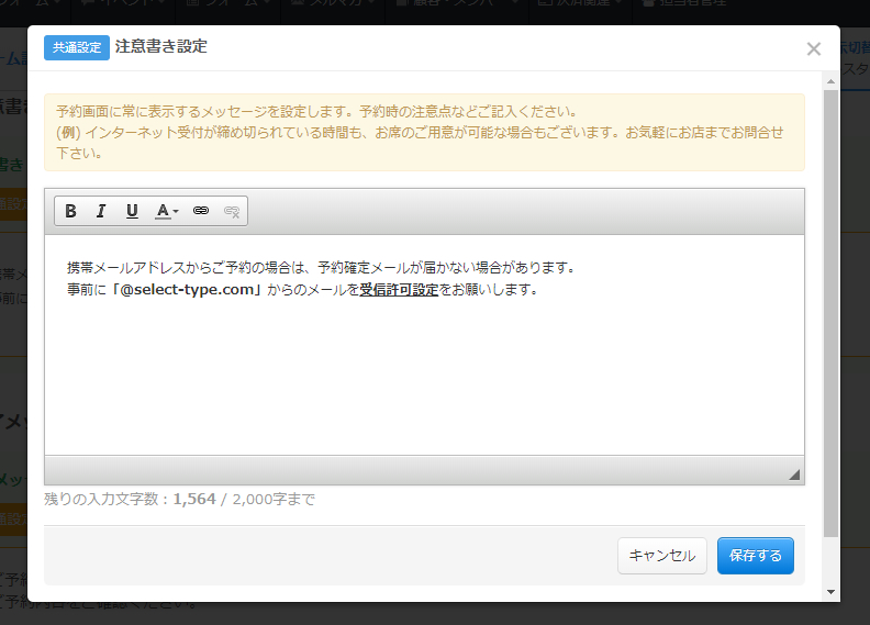 予約カレンダーの上部には、予約に関する注意事項などを記載することが出来ます。