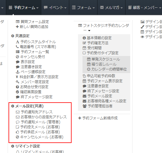 SELECTTYPEから予約に関するメールの設定はヘッダーメニュー「予約フォーム」⇒「メール設定(共通)」にて各種設定が行えます。
