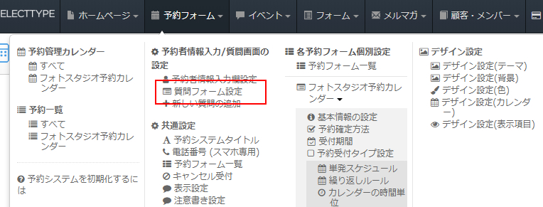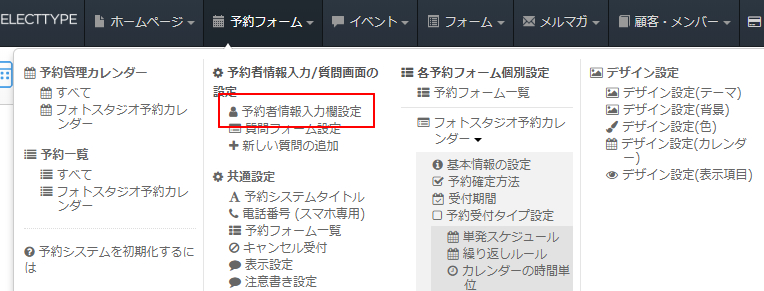 ページ上部「予約フォーム」⇒「予約者情報入力設定」をクリックします。