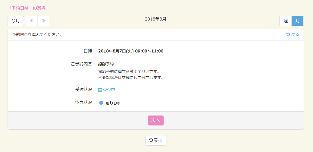 この記事でご紹介すフォトスタジオ・写真館向けテンプレートは以下になります。予約カレンダーの表示や予約受付の流れを確認頂けます。テスト予約しても問題ありませんのでぜひ実際の挙動をご確認ください。