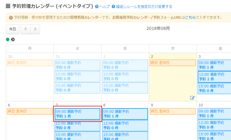 続いて予定だけ表示させる(予約を受け付けない)機能を使用して定休日情報を設定してみましょう。