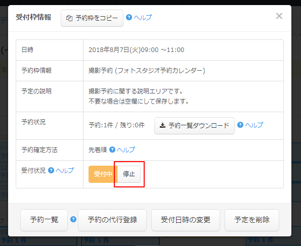 指定した枠の受付を「停止」したり「再開」したり切り替えることができます。