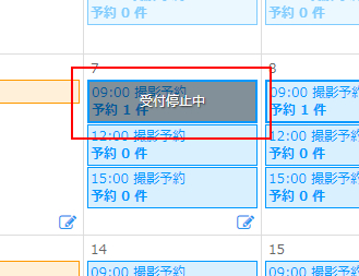 受付状況にて停止ボタンをクリックすると、その枠の受付が停止されカレンダーから受付枠の表示が非表示になります。
