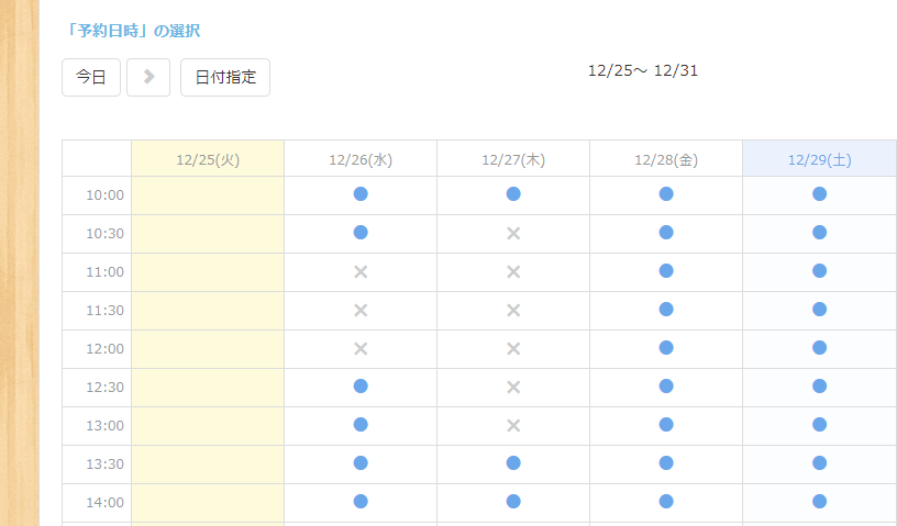 臨時休業日時が設定された日時の受付枠はカレンダー上で非表示になります。