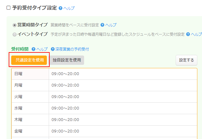 設定エリアより下の設定が営業時間タイプ用の設定に切り替わります。