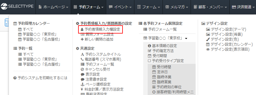 ページ上部「予約フォーム」⇒「予約者情報入力設定」をクリックします。