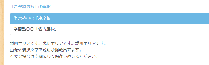 「「予約フォーム」の説明」を登録すると店舗(教室)ごとの説明テキストを表示させることも可能です。