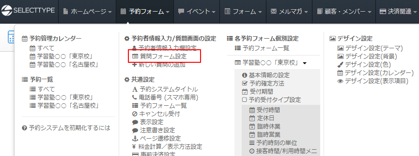 ヘッダーメニュー「予約フォーム」より「質問フォーム設定」をクリックします。