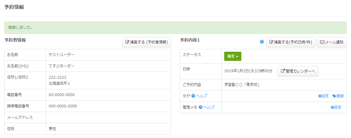 登録が完了すると、登録した予約情報の詳細画面が表示されます。