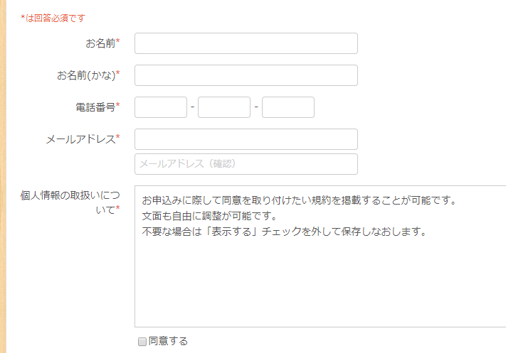入力項目は設定画面にてどの項目(名前や住所、生年月日など)を設置するか指定されたものだけ表示されます。