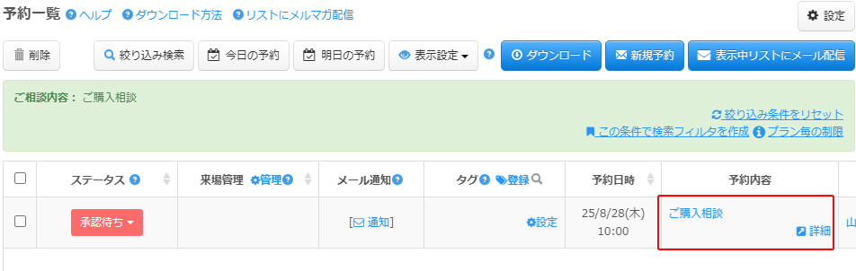 予約一覧が表示されますので、該当予約情報の予約内容リンクをクリックして詳細画面にアクセスします。