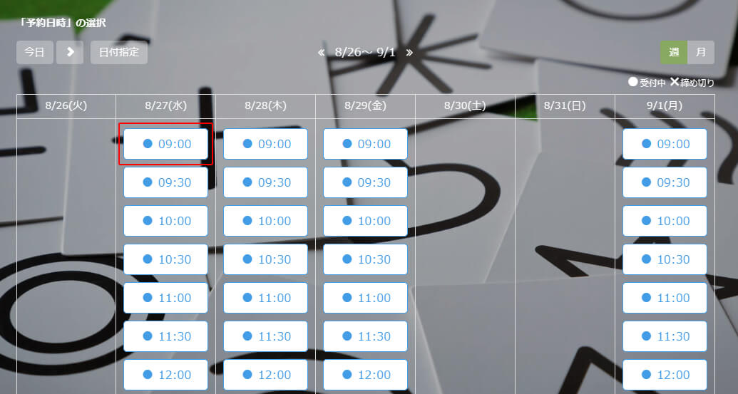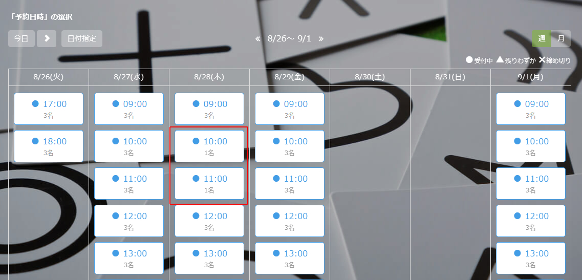 これで設定した受付時間に受付枠が表示されるようになります。 テストで予約をしてみてどのように受付枠が消費されるのか確認してみましょう。