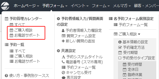 上部メニュー「予約フォーム」→「各予約フォーム個別設定/フォームタイトル/予約受付タイプ設定」をクリックします。