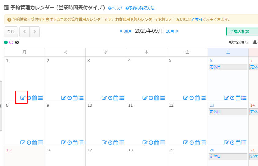 予約管理用のカレンダーが表示されます。 予約を入れたい日付枠の右下にありますアイコンの一番左のアイコンをクリックします。