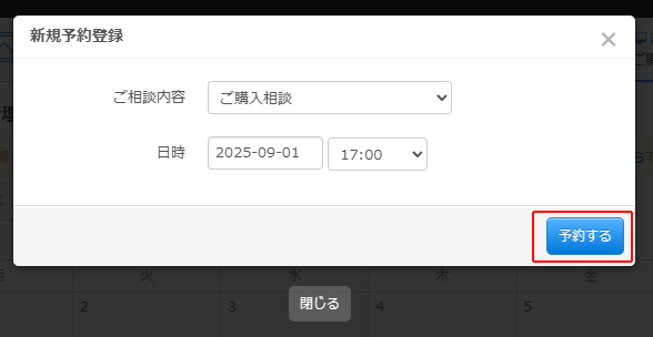 新規予約登録画面が表示されます。 日時を指定して「予約する」をクリックします。