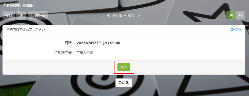 日付を選択すると予約内容画面が表示され「次へ」をクリックします。