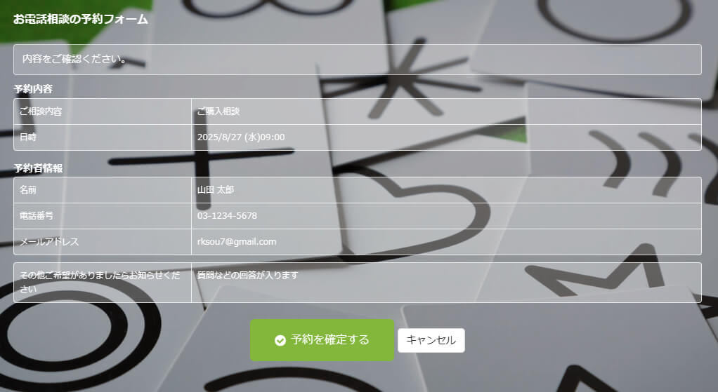 予約の内容、予約者の情報に問題がなければ確定し送信します。