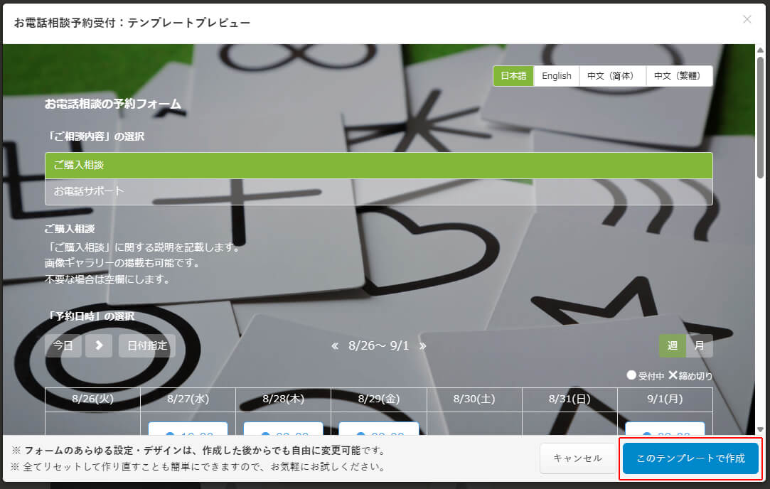 「テンプレートプレビュー」で予約フォームを確認することができます。 「このテンプレートで作成」をクリックしますと予約フォームが仮のデータで作成されますので利用されるサービスにあわせて調整していきましょう。