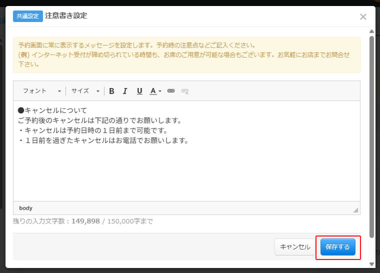 予約フォームの画面上部に登録された注意書きテキストが表示されます。