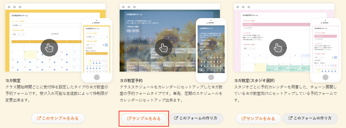 予約システムの紹介ページからもテンプレートを選んで作成できます。