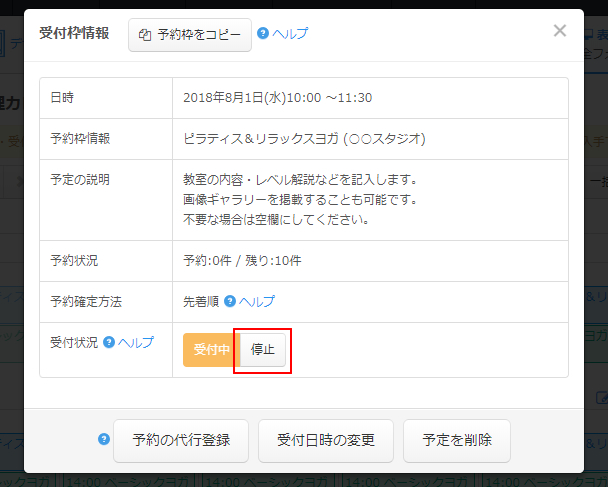急遽ある時間帯のスケジュールを受付を停止しなければいけない場合には受付停止/再開機能を使うと便利です。