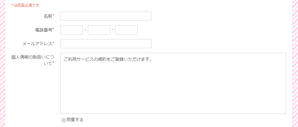 利用規約の掲載と同意チェックフォームの設置も可能です。