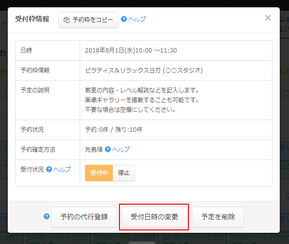 ヨガ教室のレッスンスケジュールにあわせて受付枠を登録していきましょう。