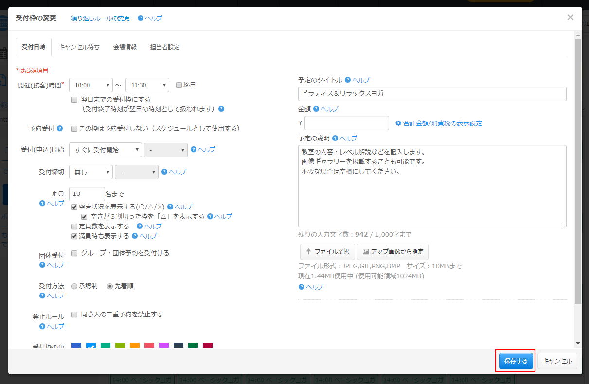 受付枠の変更が表示されますので、開催(接客)時間や定員数を変更して「保存する」をクリックします