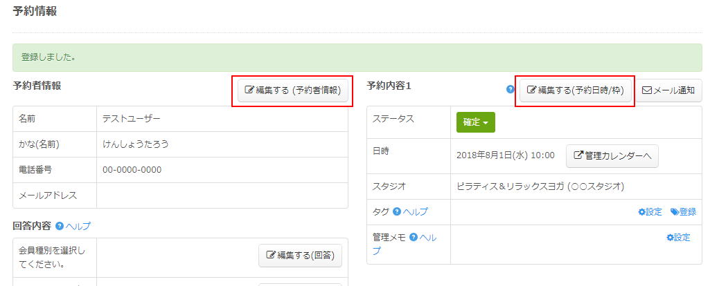 ご登録の内容に漏れなどがあれば、予約者情報、予約内容の編集から変更を行えます。