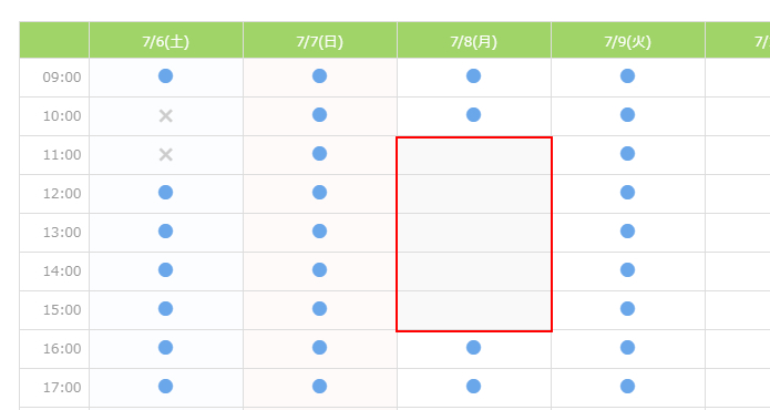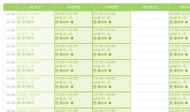 例えば日曜日の9時から18時の間を60分区切りで予約を受付けるといった設定が可能です。